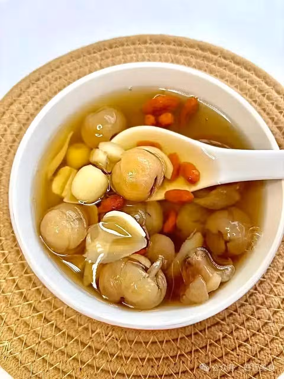 桂圓10顆➕百合15克➕蓮子15克➕枸杞8克(喜歡甜口吃可以加點冰糖)