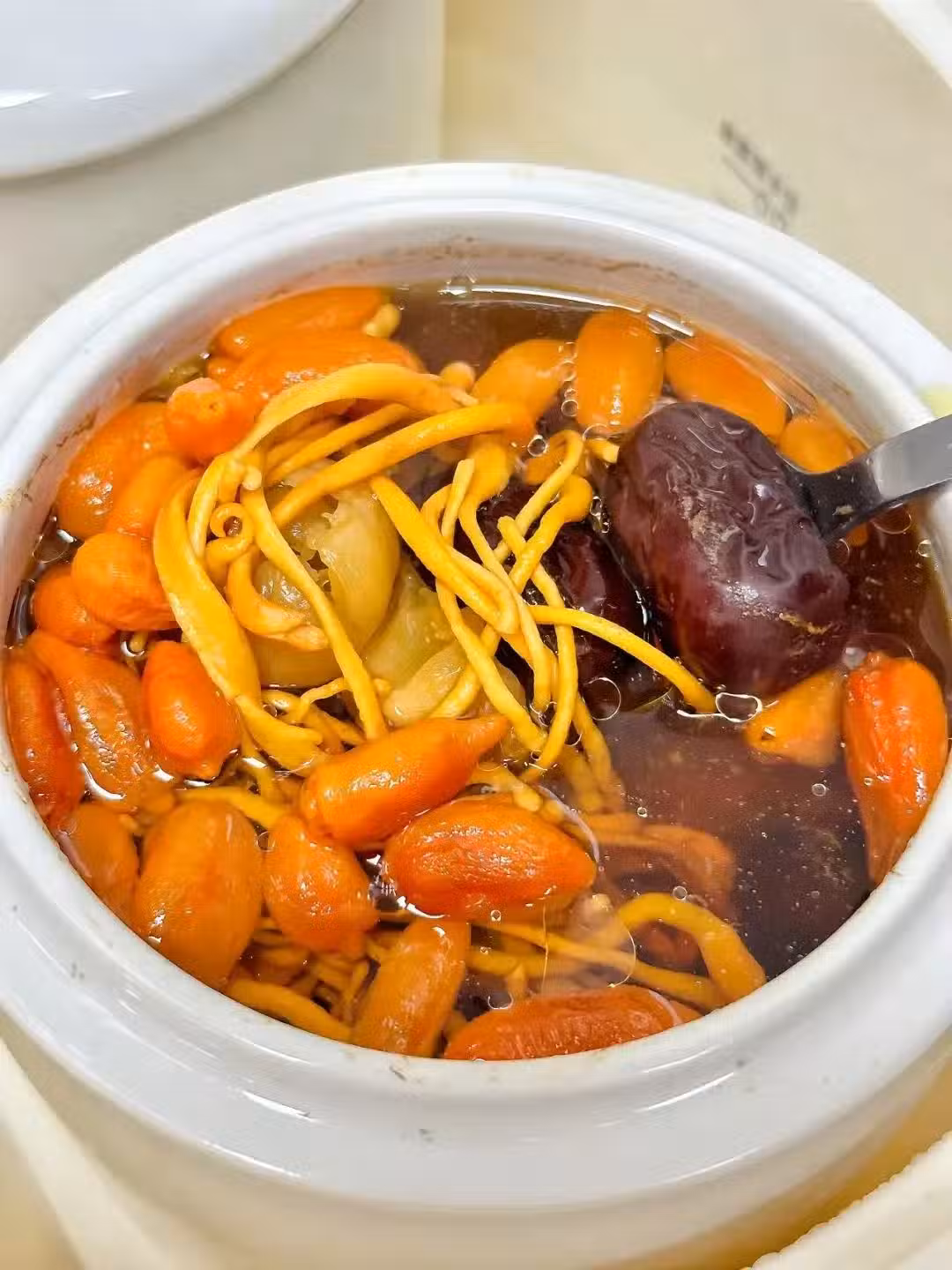 這湯喝著像雲朵一樣滑進喉嚨,蟲草花那股子鮮味把肉香吊得足足的!關鍵這金湯色看著就富貴,我家娃說像喝魔法藥水,咕咚咕咚幹完還舔碗邊,特別愛喝~上回我婆婆咳嗽,我往湯里懟了半塊陳皮,老太太連喝三天說比止咳糖漿得勁!
