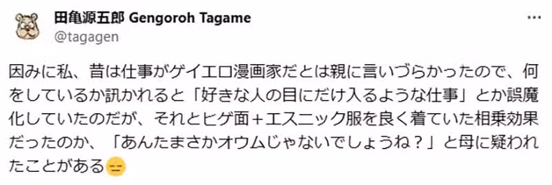 田龜源五郎表示,當他在1990年代開始全心全意投入創作男同志漫畫的時候,由於社會對於這種性向還有著諸多歧視,導致他一直不敢對父母大方坦承自己的工作……