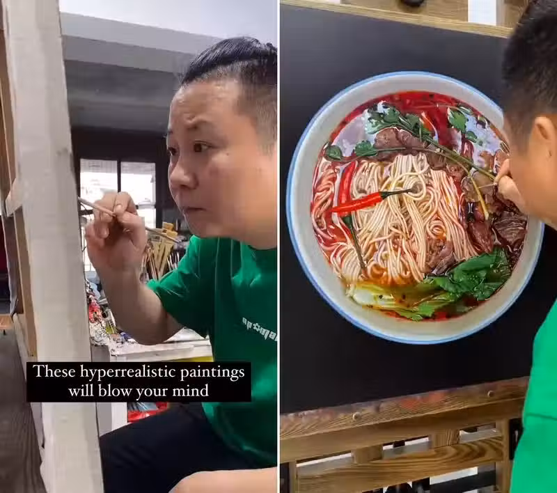 今天分享的這位超寫實食物繪畫家「Ai Senli」,他最近的一些影片被轉發到網絡上,之所以他的作品可以被無數網友觀看跟分享,主要就是他可以把畫這門藝術畫到極致,而極致的表現就是變得不像畫惹,底下這是他畫一碗牛肉麵的圖,不管從麵條、辣椒、湯甚至油光的反射,你很難想像這是一幅畫,我想如果不說穿的畫,可能真的以為這是一張高清的牛肉麵照片吧!?