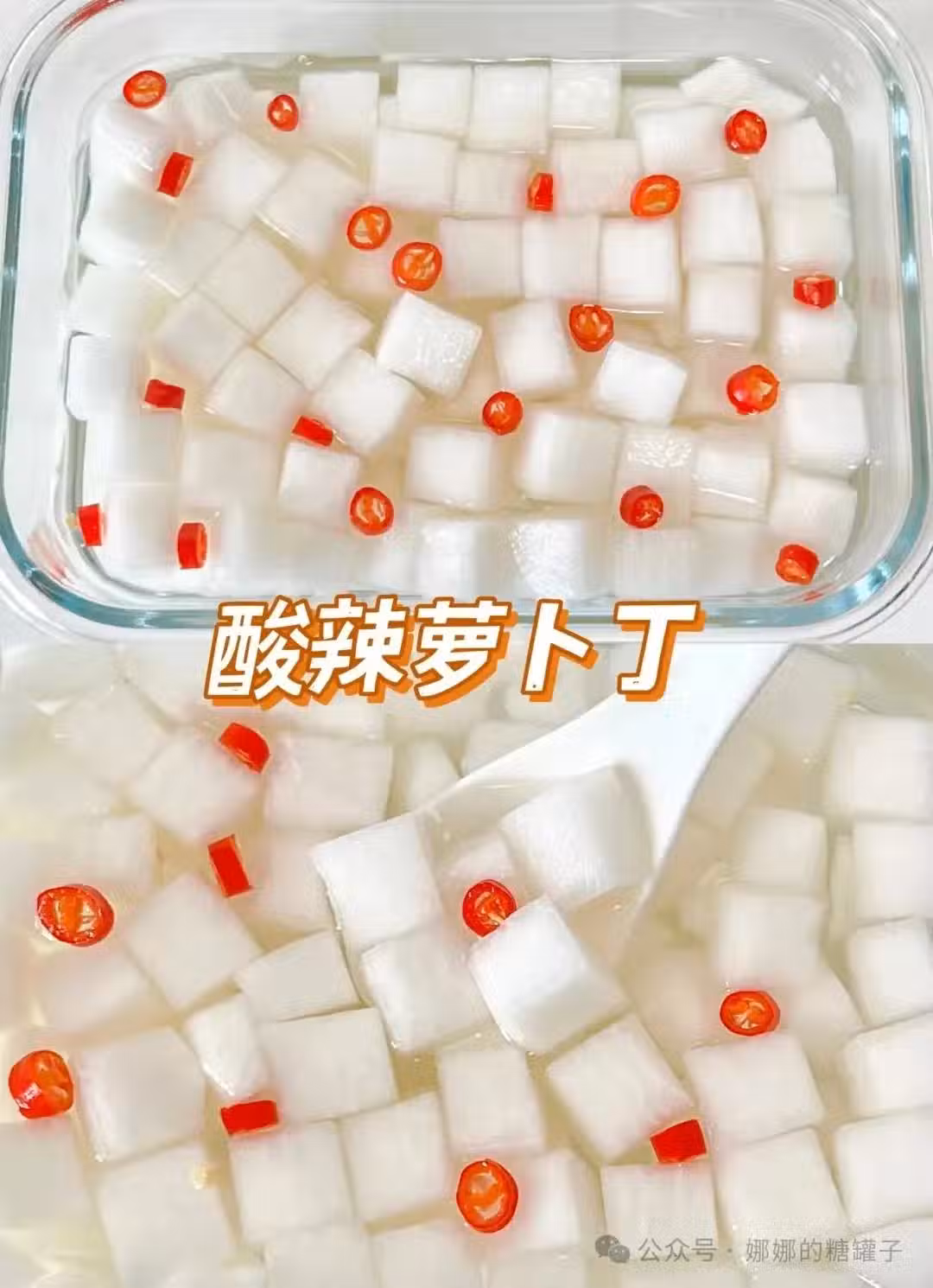 1.白蘿蔔去皮切丁加2勺白糖。