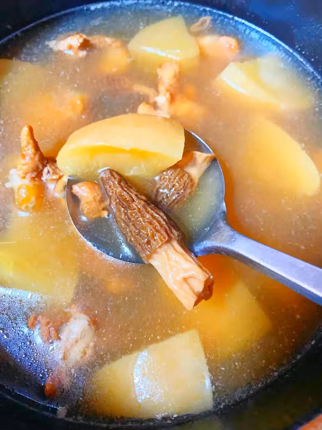 2. 燉煮:把處理好的蘋果、干淮山、羊肚菌、無花果和豬骨放入湯鍋中,加入適量清水(一般以沒過食材2-3厘米為宜)。大火燒開後轉小火慢燉1.5-2小時。