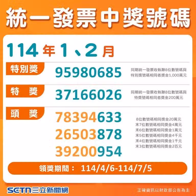 114年1、2月期統一發票千萬特別獎號碼為「95980685」,200萬特獎號碼為「37166026」,頭獎3組分別為「78394633、26503878、39200954」,8位數號碼與頭獎號碼相同者獎金20萬元;末7位數號碼與頭獎中獎號碼末7位相同者各得獎金4萬元;末6位相同得1萬元;末5位相同得4千元;末4位相同得1千元;末3位相同得200元。