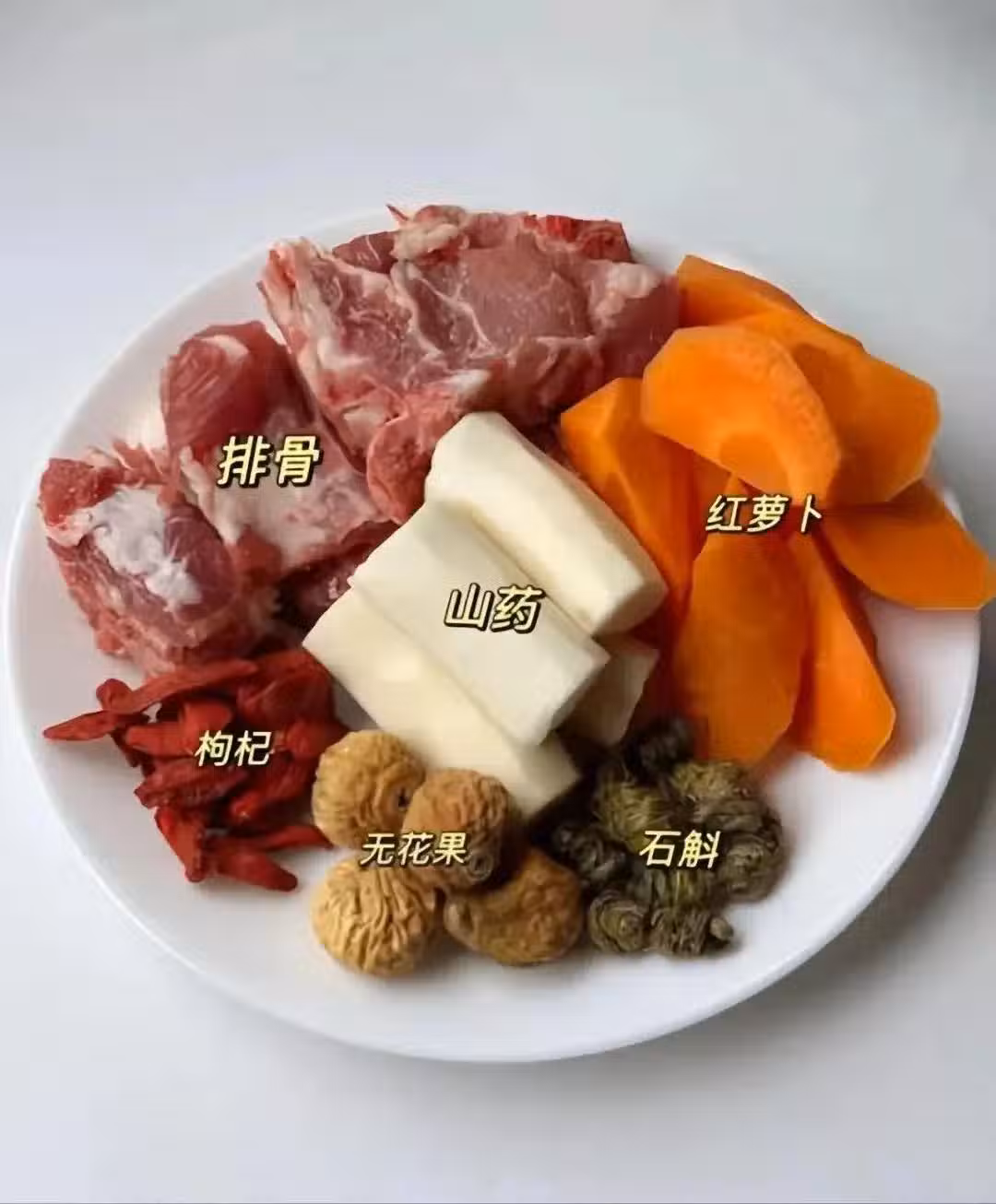 春季!養肝正當時,孩子動不動玩手機不注意休息,熬夜寫作業,經常揉眼、注意力不集中、視力下降 這款湯養肝明目,滋陰清潤,春天喝這個好。這道由石斛、鐵棍山藥、紅蘿蔔、無花果、枸杞和排骨組成的湯,石斛是一種名貴的中藥材有益胃生津、滋陰清熱的功效。它能幫助調節人體的免疫力,改善陰虛火旺的症狀。山藥富含多種胺基酸有助健脾益胃、助消化,胡蘿蔔有助於保護視力、增強免疫力,還能促進腸道健康,無花果有潤肺止咳、清熱生津的作用,還含有豐富的膳食纖維,助於促進腸道蠕動,枸杞可養肝明目、排骨富含蛋白質和鈣質,有助於增強骨骼。