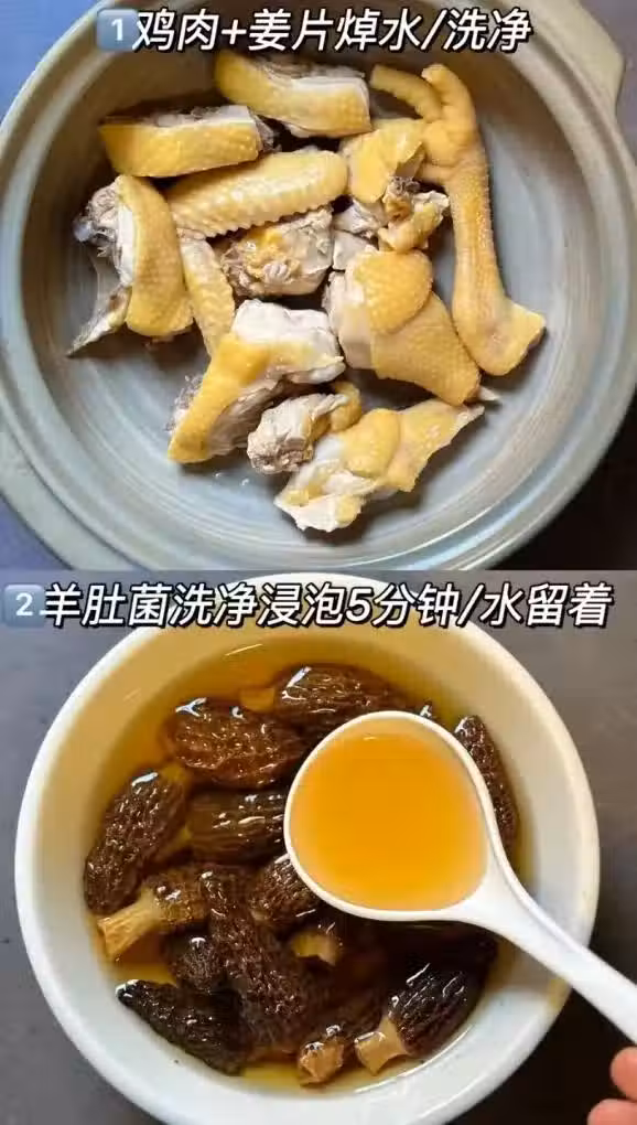 4. 處理好的雞肉、羊肚菌和其他食材一起放入鍋中;