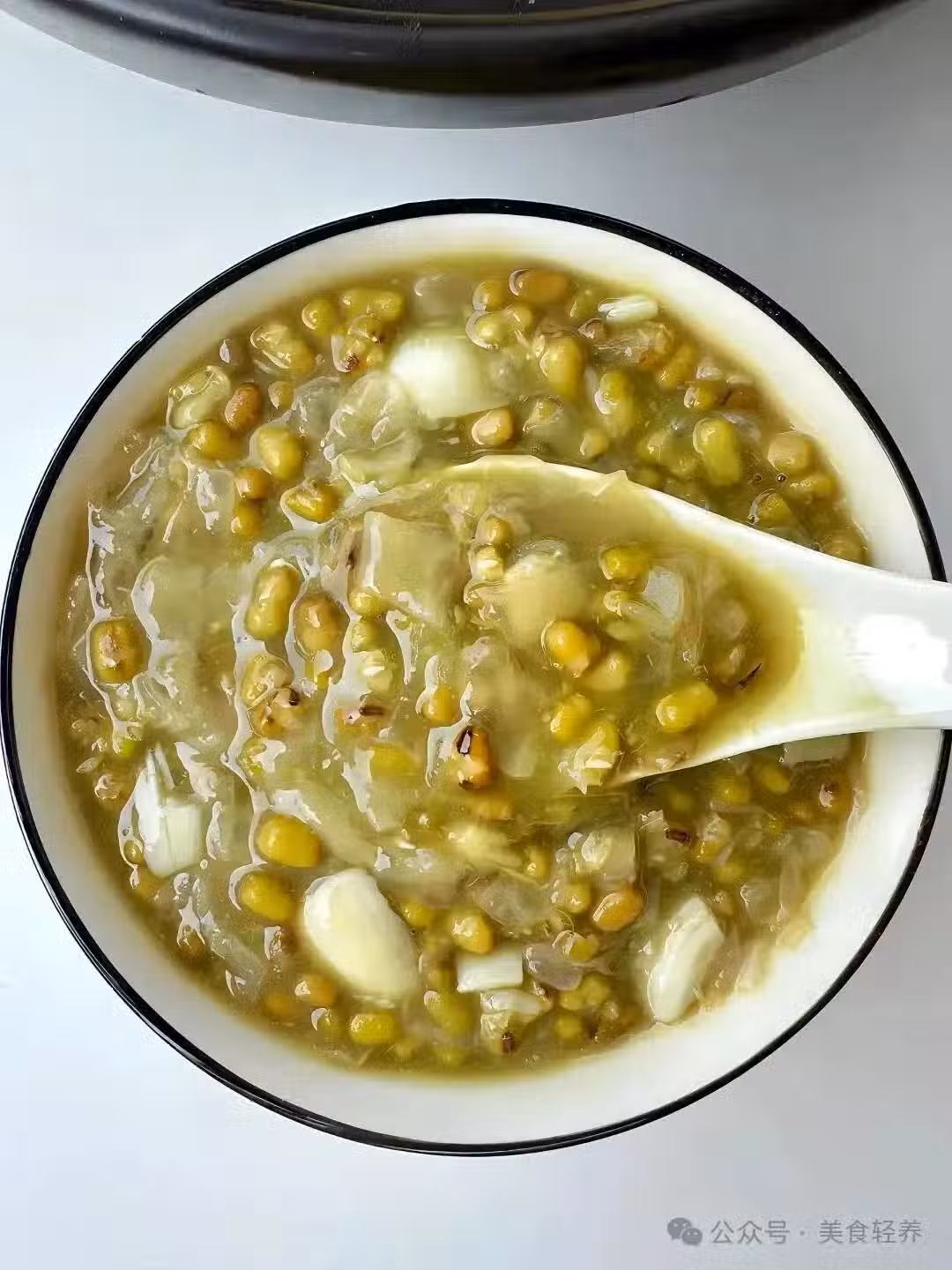 綠豆50克、銀耳1朵、百合10克、冰糖適量