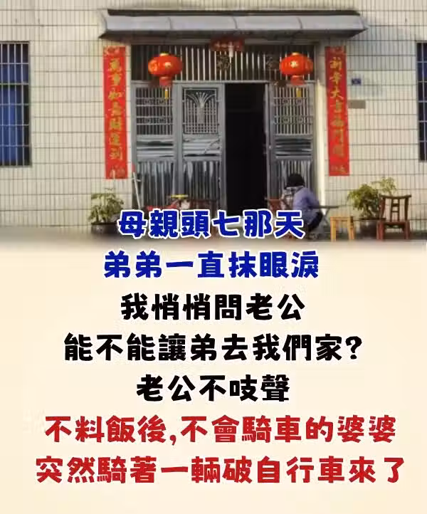 母親頭七那天,弟弟一直抹眼淚,我悄悄問老公,能不能讓弟去我們家?老公不吱聲,不料飯後,不會騎車的婆婆突然騎著一輛破自行車來了