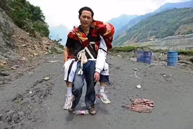 2008年5月15日,四川省汶川縣映秀鎮的山路上,有一位父親正背著兒子艱難前行。