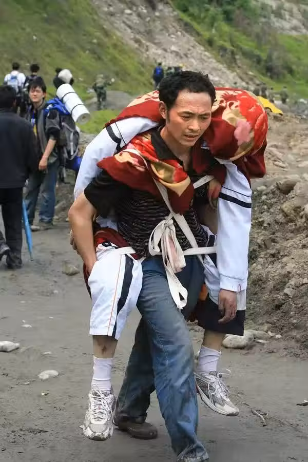 走到相對平坦的地方時,劉志珍拿路邊斷裂的樹幹做了個簡陋的擔架,和丈夫一起把兒子抬著走。