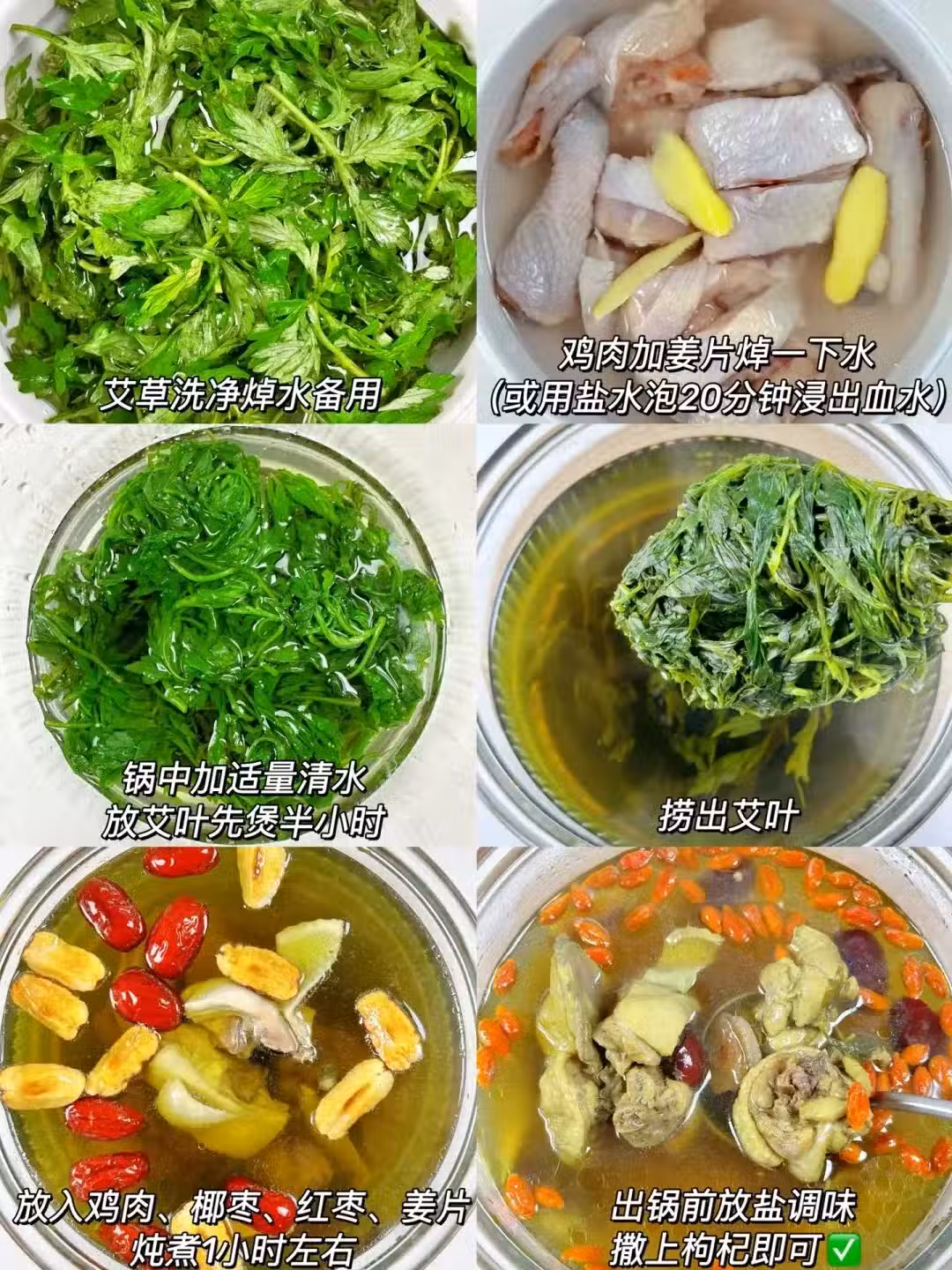 艾葉具有溫經散寒的功效,與雞肉相結合,能形成一道滋補暖胃的佳品。特別適合在寒冷的季節食用,能迅速恢復體力,提高免疫力。祛濕散寒:艾葉被譽為「婦科要藥」,其溫經脈、逐濕寒的特性在調理女性體質虛寒、月經不調等方面有著卓越的表現。喝上一碗鮮艾葉老雞湯,不僅能暖身驅寒,還能溫經止血、補益氣血。