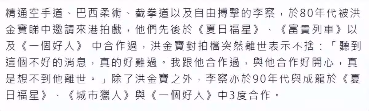 洪金寶接受採訪表示不舍,坦言聽到這個不好的消息真的很難過,和他合作很開心,想不到他會離世。洪金寶與之合作3次,兩人是惺惺相惜的搭檔。