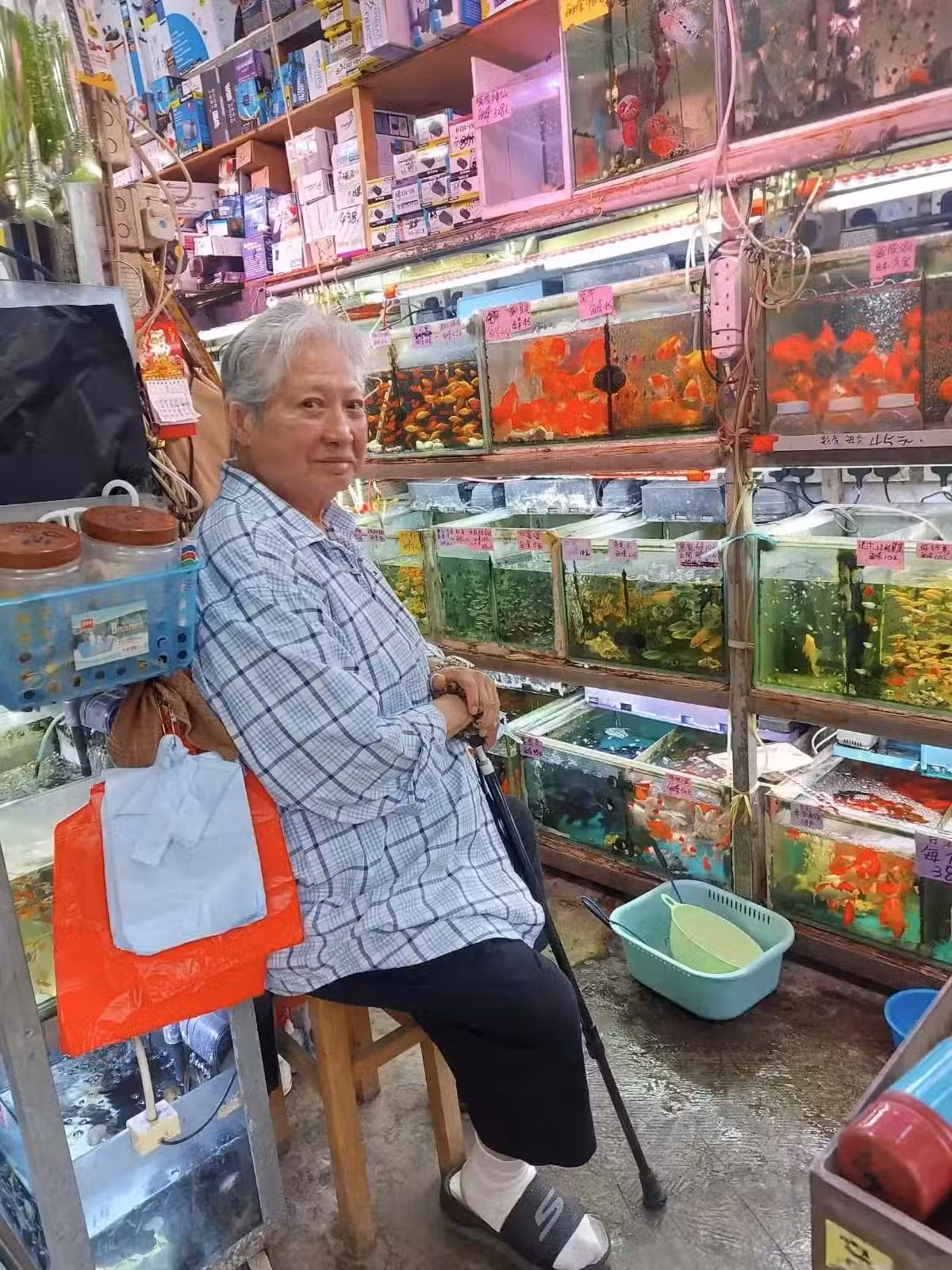 75歲洪金寶在香港,去一家店看金魚,穿著拖鞋出行,打扮不像明星