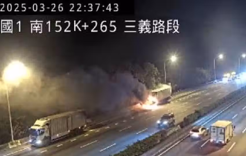 國道一號北上153公里三義路段驚傳死亡交通事故!兩輛大貨車發生擦撞,位於後方的大型物流車起火燃燒,28歲的潘姓男駕駛受困其中、不幸慘死,至於前方的張姓駕駛及葉姓乘客也受傷送醫。