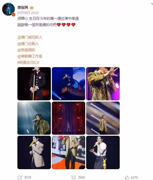 蕭敬騰的38歲生日很熱鬧,30日他和老婆還有團隊人員一起在澳門與歌迷們度過。