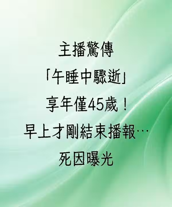 主播驚傳「午睡中驟逝」 享年僅45歲!早上才剛結束播報…死因曝光