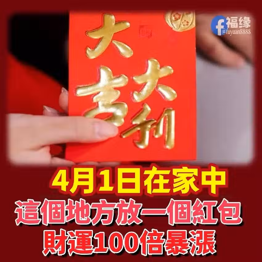 風水師偷偷透露:4月1日在家中這個地方,放一個紅包,竟能讓財運100倍暴漲,好運一路旺到年底...!