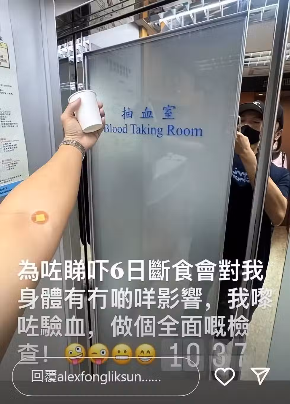 到翌日起床,方力申就現身於診所門外,原來他要驗血:「為了看一下6天斷食會對我身體有沒有什麼影響,我來驗血,做個全面的檢查。」於圖片所見,戴上鴨舌帽、穿上藍色短Tee的方力申左前臂貼上膠布,已完成抽血進程。