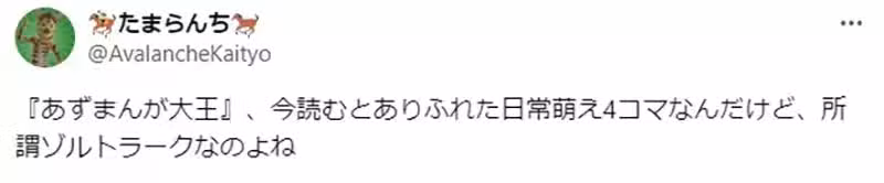 「《笑園漫畫大王》算是日常動畫的始祖,也是萌系四格漫畫的始祖,毫無疑問是非常厲害的作品。然而因為已經被廣泛研究,並且相當普及,所以也變成像是Zoltraak的作品了呢。」