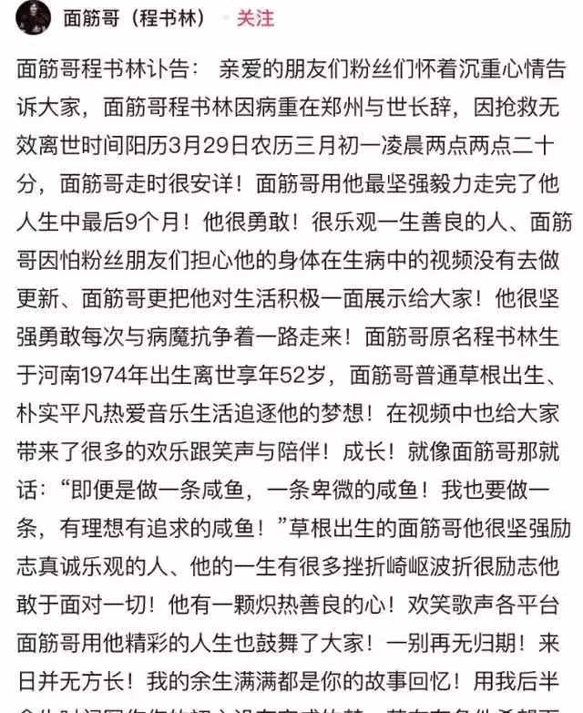 親愛的朋友粉絲們,懷著沉重的心情告訴大家,麵筋哥程書林因病重在鄭州與世長辭。