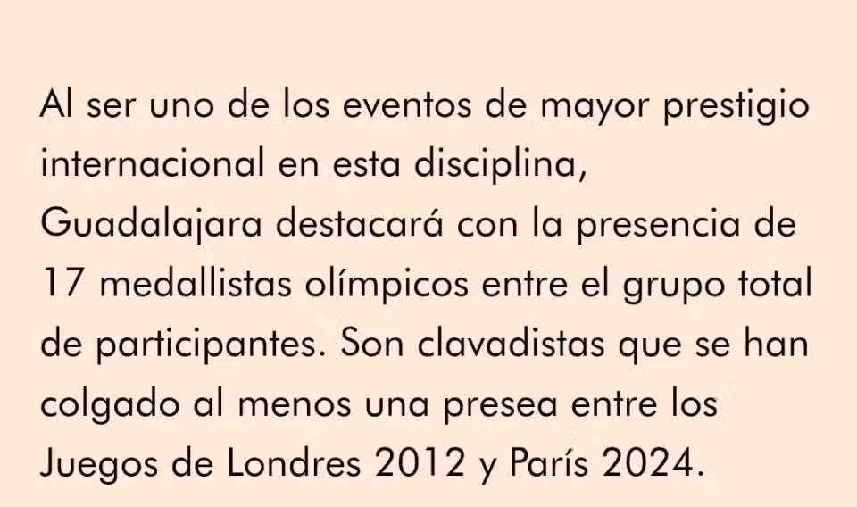 跳水世界盃是瓜達拉哈拉最負盛名的國際賽事之一,在所有參賽者里,有17名奧運會獎牌得主。他們從2012年倫敦到2024年巴黎,至少獲得過一枚奧運獎牌。