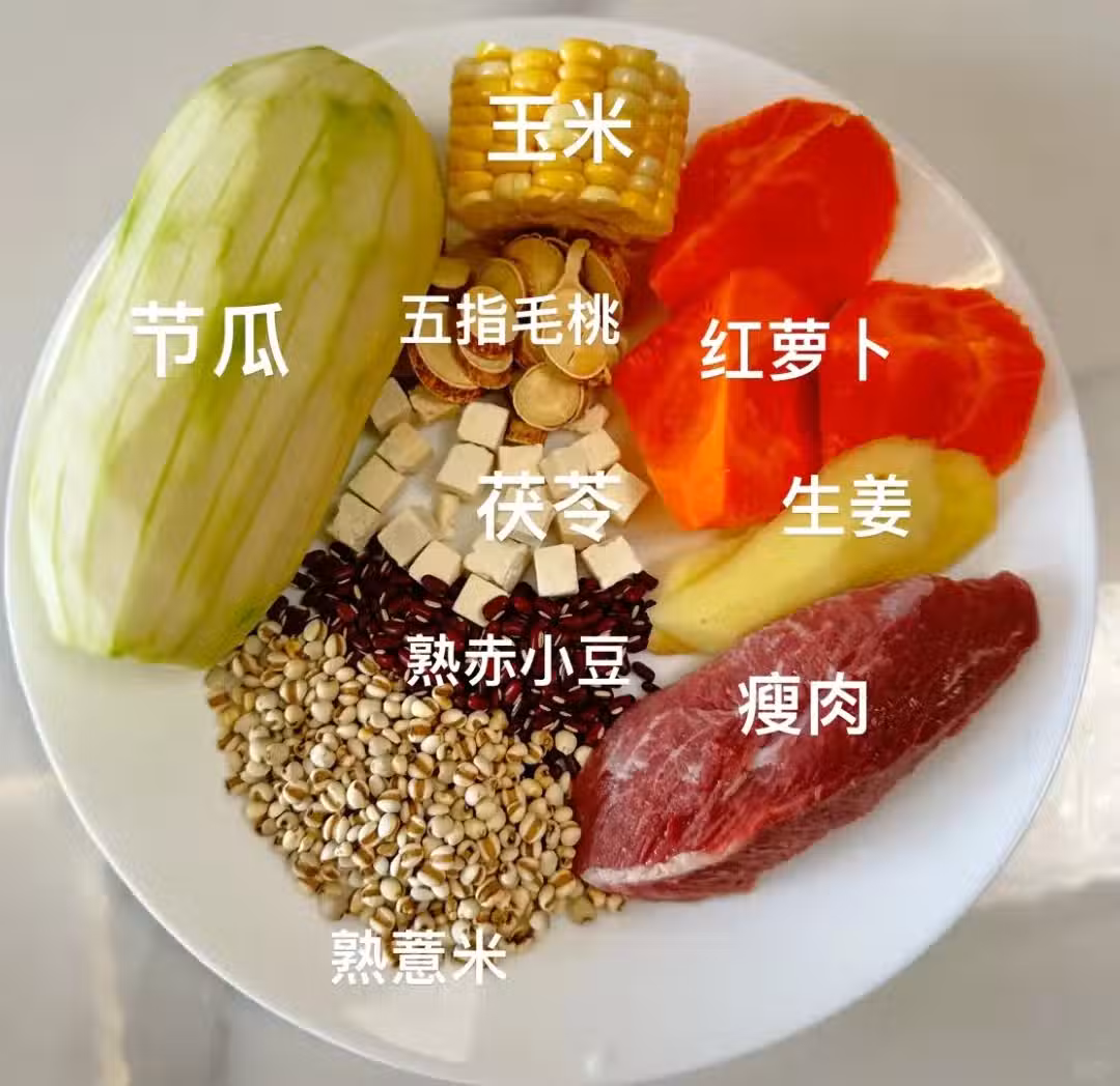 食材:瘦肉1斤,玉米1根,紅蘿蔔1根,節瓜1個,赤小豆30克,茯苓10克、薏米30克,蜜棗2粒,生薑2片。