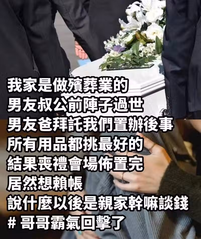 我家是做殯葬業的,男友叔公前陣子過世,男友爸拜託我們置辦後事,所有用品都挑最好的,結果喪禮會場布置完,居然想賴帳,說什麼以後是親家、幹嘛談錢 # 哥哥霸氣回擊
