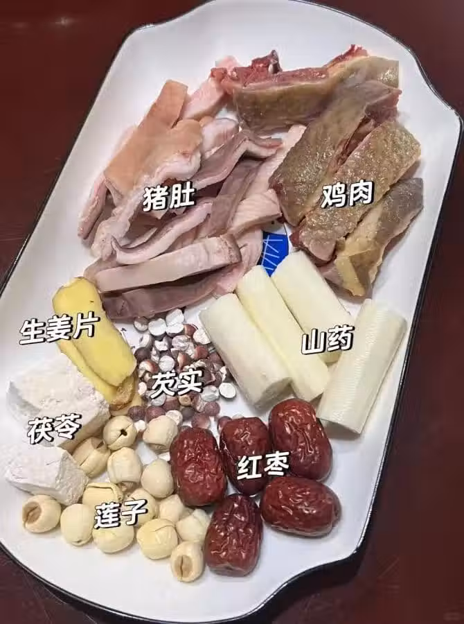 材料備齊:雞肉半隻,豬肚半個,蓮子、茯苓、芡實各10g,鮮山藥一根,紅棗幾顆。豬肚記得提前沐浴更衣(洗凈),再切塊待命。藥材們也要乾乾淨淨的哦!山藥削皮切塊,白 白嫩嫩惹人愛!🥕