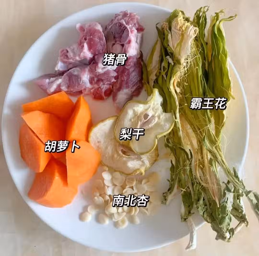 ❶豬骨洗乾淨放蔥姜料酒冷水下鍋焯水,撈出用溫水洗乾淨浮沫,胡蘿蔔去皮切塊,南北杏和梨乾清洗乾淨,霸王花提前泡發備用。