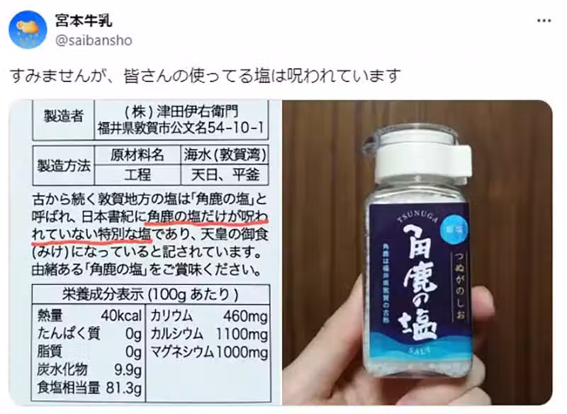一位暱稱「宮本牛乳」的日本X網友,最近分享了自己購買的一款食鹽,隨即引爆將近20萬人按贊、轉發的熱烈反響!