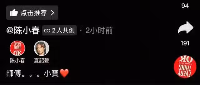 4月6號,陳小春罕有於視頻帳號上分享聚會的畫面,與此前的想像不同,這次聚會的人物並不是「七個老婆」中的一位,而是他劇中師父陳近南,這一角色的扮演者便是夏韶聲。