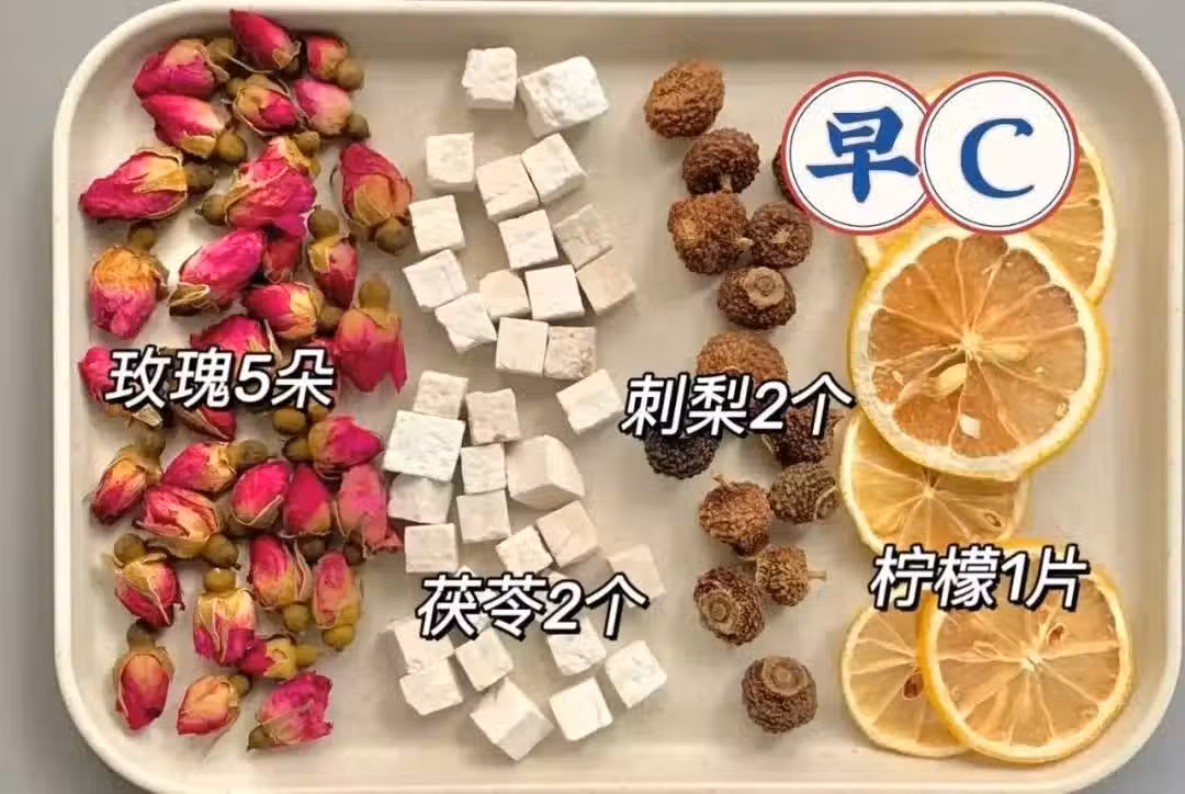 食材:玫瑰5朵、山楂干3片、荷葉2g、陳皮1小片