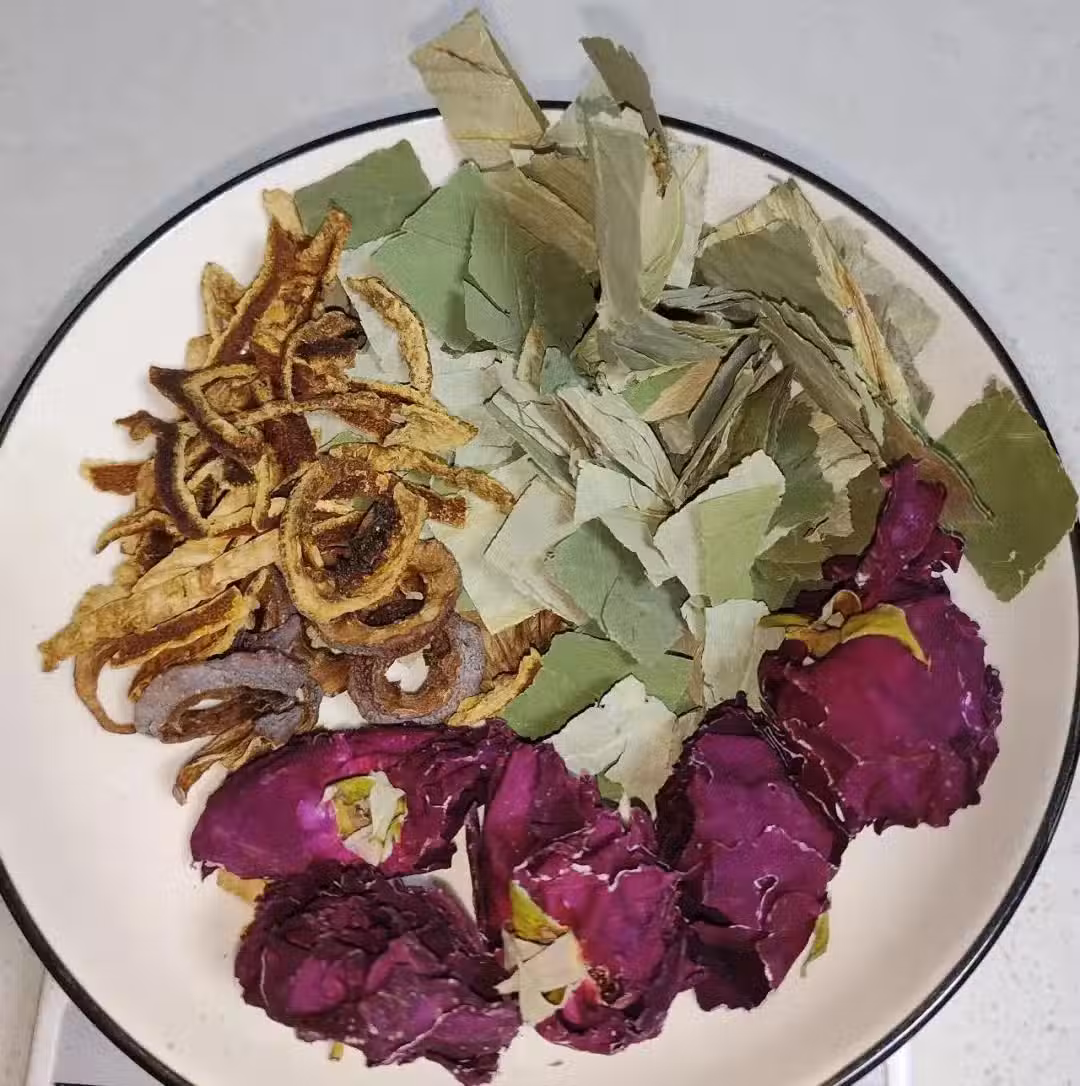 做法:菊花與玫瑰花用沸水沖泡,然後加薄荷葉和冰糖燜3分鐘。