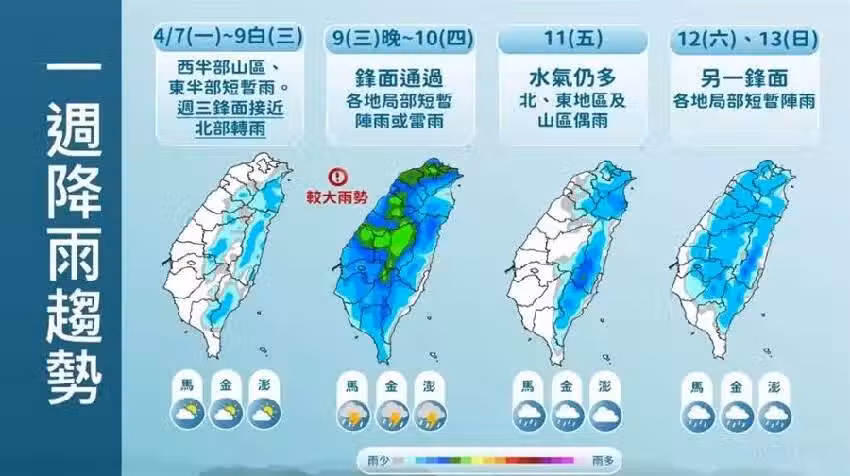 氣象署提到,連江縣、金門縣及宜蘭縣5日起至12日間天氣偏涼且時有陣雨或雷雨,氣溫普遍在15至26攝氏度之間。