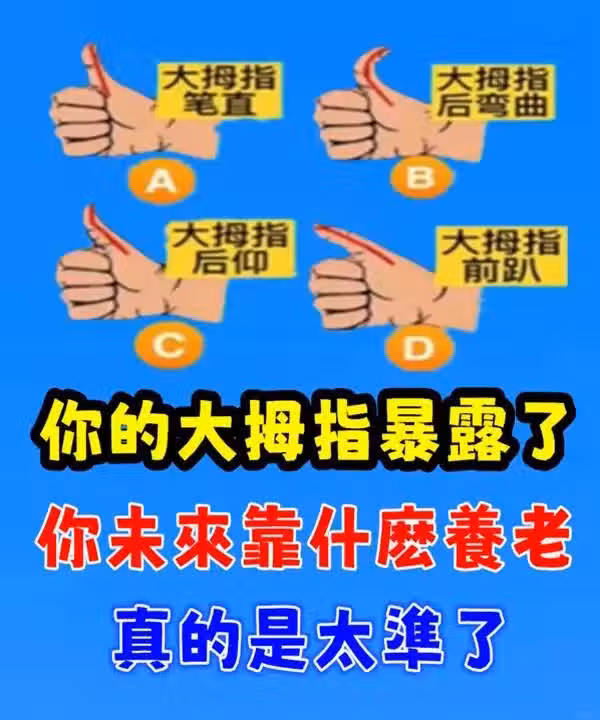 我們不能完全控制自己的生死富貴,只能盡力而為。努力和上進,不是為了做給別人看,而是為了不辜負自己,不辜負此生。你的大拇指暴露了你未來靠什麼養老!太准了!