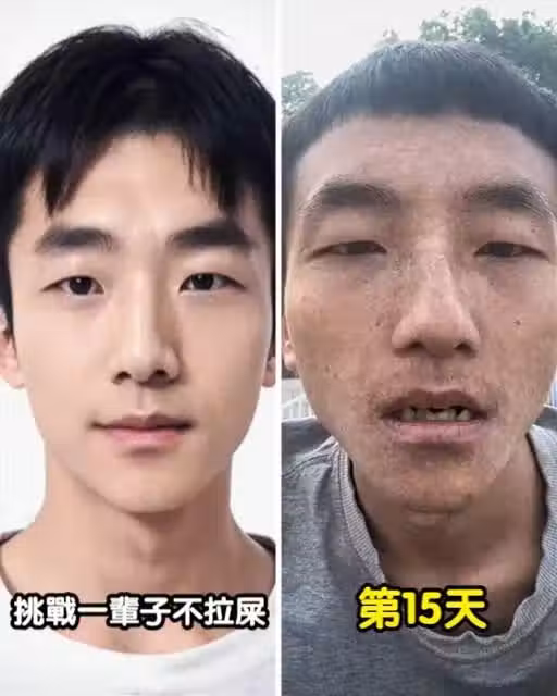 這是一位小伙子自稱挑戰「一輩子不拉屎」,並聲稱已經堅持了第15天。