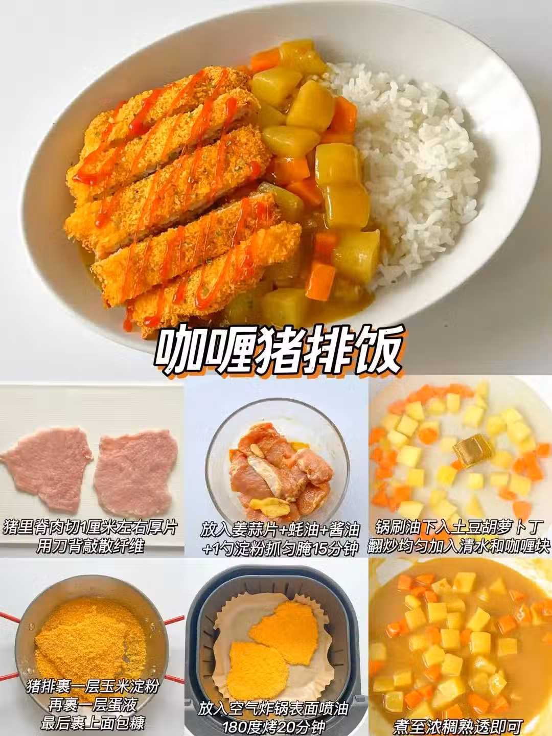 ① 豬排用刀背拍松,裹蛋液+麵包糠,炸到金黃(空氣炸鍋180℃20分鐘也行);