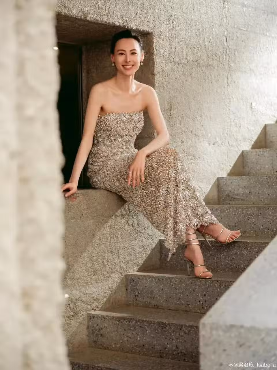 36歲梁洛施出席時尚活動,身穿抹胸長裙氣質高貴,戀愛後容光煥發