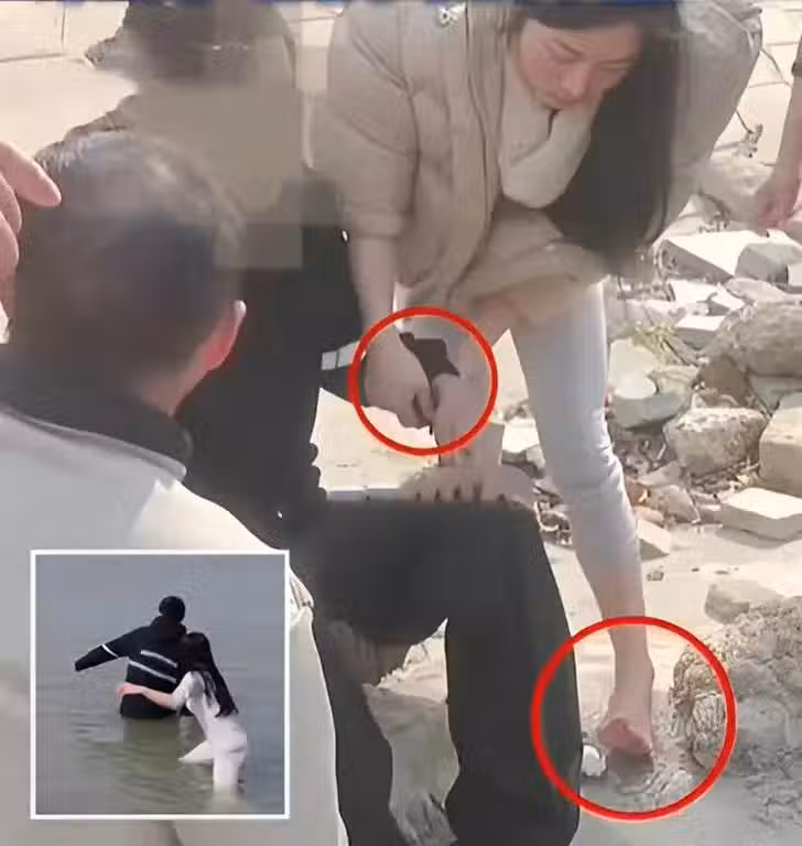 她冒著自己無法游泳的風險,光著腳奮力相救,甚至顧不上穿鞋,卻仍細心地為小伙子擰衣服。