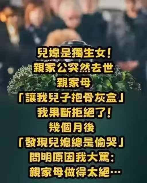 兒媳是獨生女!親家公突然去世了,親家母「讓我兒子抱骨灰盒」我果斷地拒絕了! 幾個月後「發現兒媳總是偷哭」問明原因我大罵:親家母做得太絕~