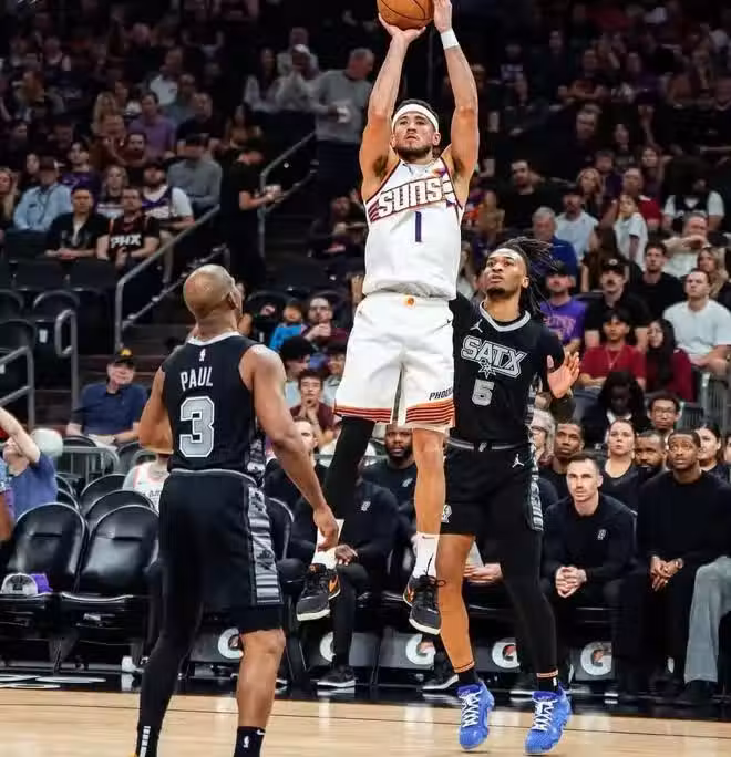 4月13日,馬刺客戰太陽。開場後尚帕尼和卡斯爾手感不錯不斷取分,馬刺領先結束首節;次節馬刺斷電,瓊斯和比爾的發揮幫助太陽反超比分,布克最後兩分鐘連突帶投拉開分差,太陽半場53-47馬刺;易邊再戰,鄧恩上來就飆中三分,太陽順勢轟出了一波39-17的高潮,比賽基本失去了懸念。最終,太陽117-98輕取馬刺。