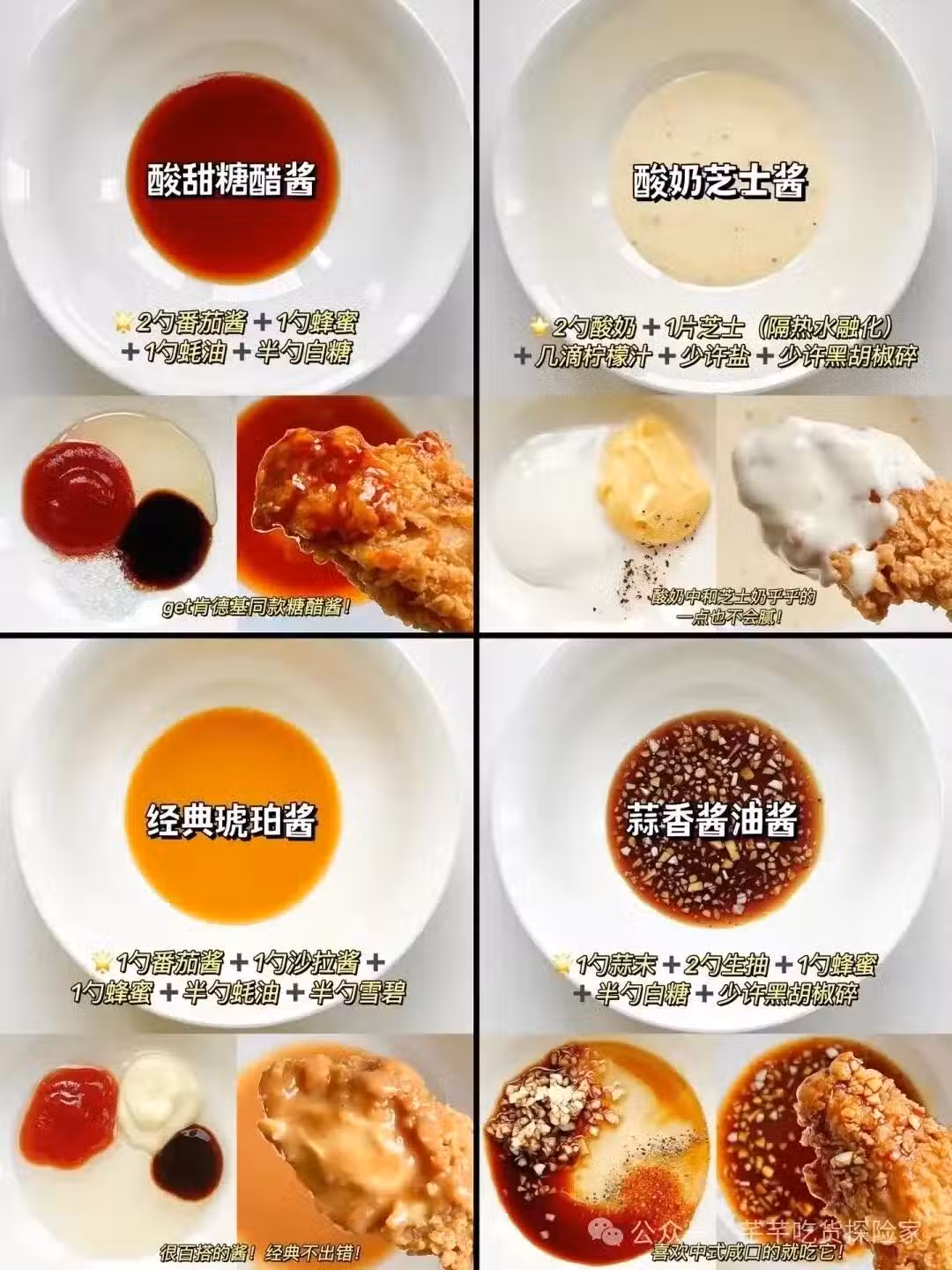 ✅韓式甜辣醬 準備需要用到的調料:蒜末,韓式辣醬,番茄醬,生抽,蜂蜜。 ✅蜂蜜芥末醬 準備需要用到的調料:芥末醬,沙拉醬,蜂蜜。 接下來的幾款適合抹麵包或者蛋糕的夾心: ✅藍莓奶酪: 準備需要用到的調料:奶酪,藍莓醬,白糖或者代糖。 ✅抹茶奶酪 準備需要用到的調料:奶酪,抹茶粉,白糖或者代糖。