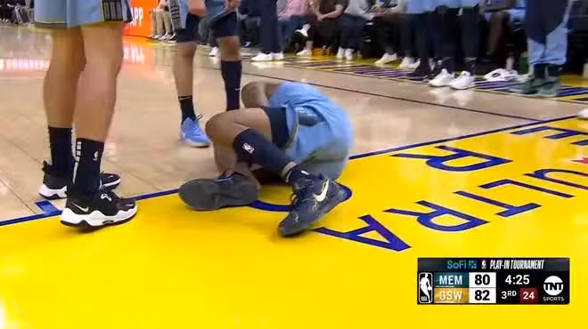 當時莫蘭特在底角後撤步出手拋投打進。本來應該是一次2+1,結果在落地的時候看起來他似乎是崴腳了。另一個角度來看,他應該是落在了巴迪希爾德的腳上。當時解說楊毅也是特意強調了:「這個球莫蘭特跳的太高了,他是往前沖的,巴迪希爾德是原地的這麼一個動作,所以說莫蘭特這次崴腳,那只能怪他自己了。」