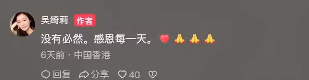 吳綺莉並沒有回應該網友,而是單獨在評論區寫下:沒有必然,感恩每一天!