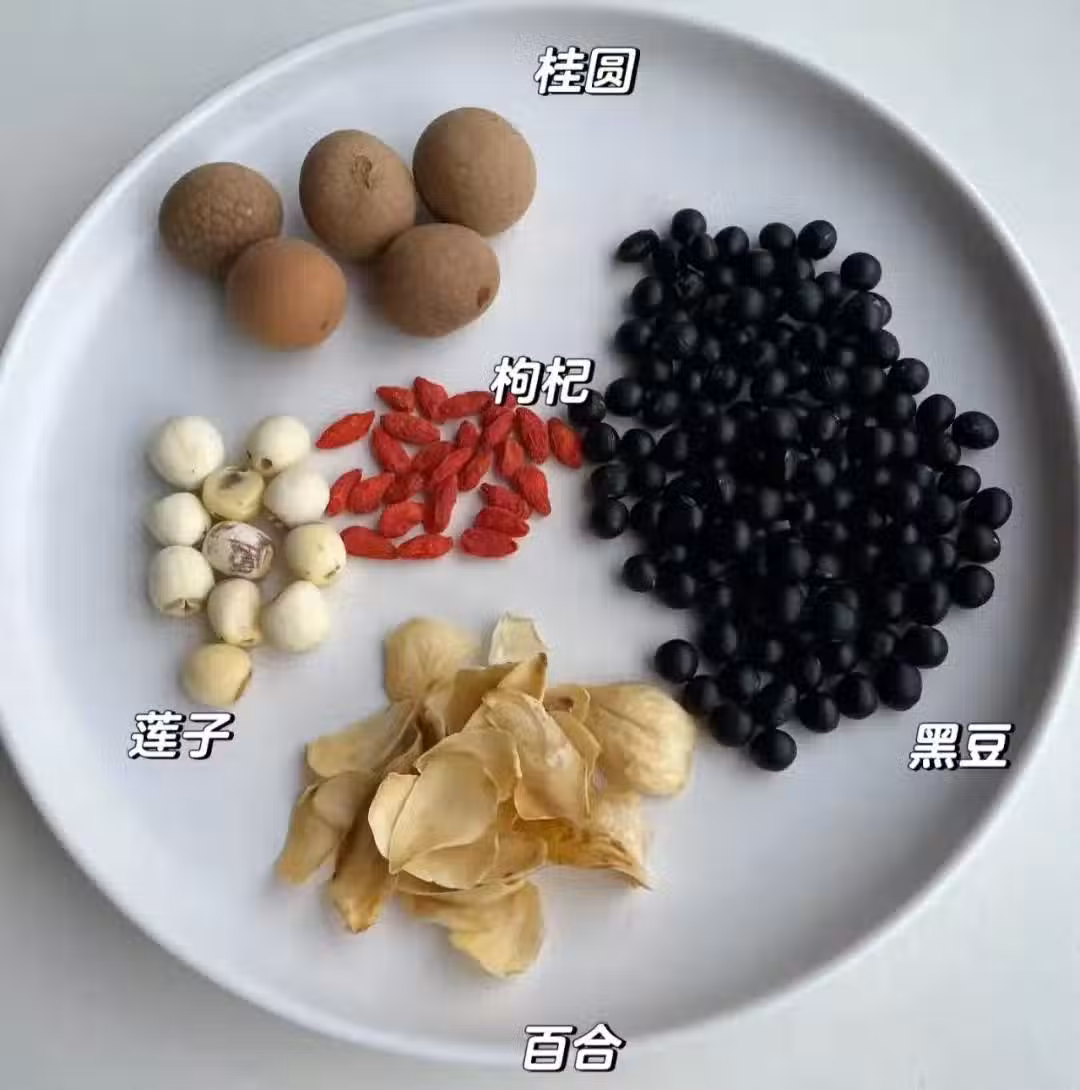 所需食材:干桂圓適量,蓮子適量,黑豆一把,百合適量,枸杞一小把