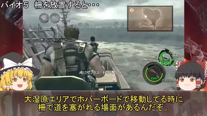 接著是「惡靈古堡7」在車庫裡伊森打傑克那段,基本上玩家打到這裡都會進行一場苦戰,但其實有個簡單的過關方法,就是開局先耗到可以拿車鑰匙,接著開車門打算開車,此時傑克會把你拖出來自己開車,這時你趁著傑克上車的時候打爆輪胎,然後等傑克開車自己撞牆自己扣血,就這樣用耗的就可以把這關給過了