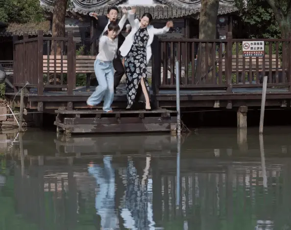 而且能看出拍攝地點就是個普通的公園水塘,水完全是綠色乾淨不到哪裡,連白色的衣服都被浸的變色。