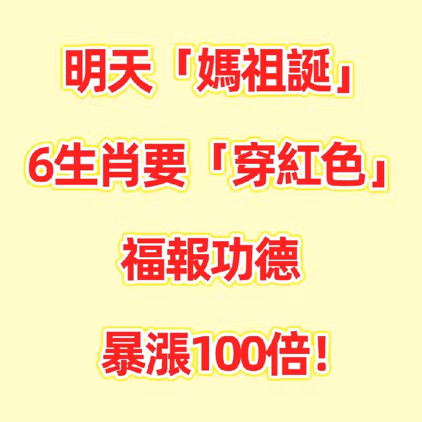 媽祖誕辰是整年「福報最強」的一天,屬於你就別錯過。 如果你或家人是這6個生肖,記得穿紅色行善、說吉祥話、祈願開運,福報真的會在不知不覺中翻倍來到你身邊。