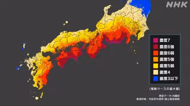 日本政府以「南海海槽」發生芮氏規模9強震進行假設,綜合海嘯與搖晃、季節、發生時間和氣象條件等推估災情。從神奈川縣到鹿兒島縣的24個府縣,共600個市町村最大震度將達6弱以上;從靜岡縣到宮崎縣的10個縣,共149個市町村將達震度7。