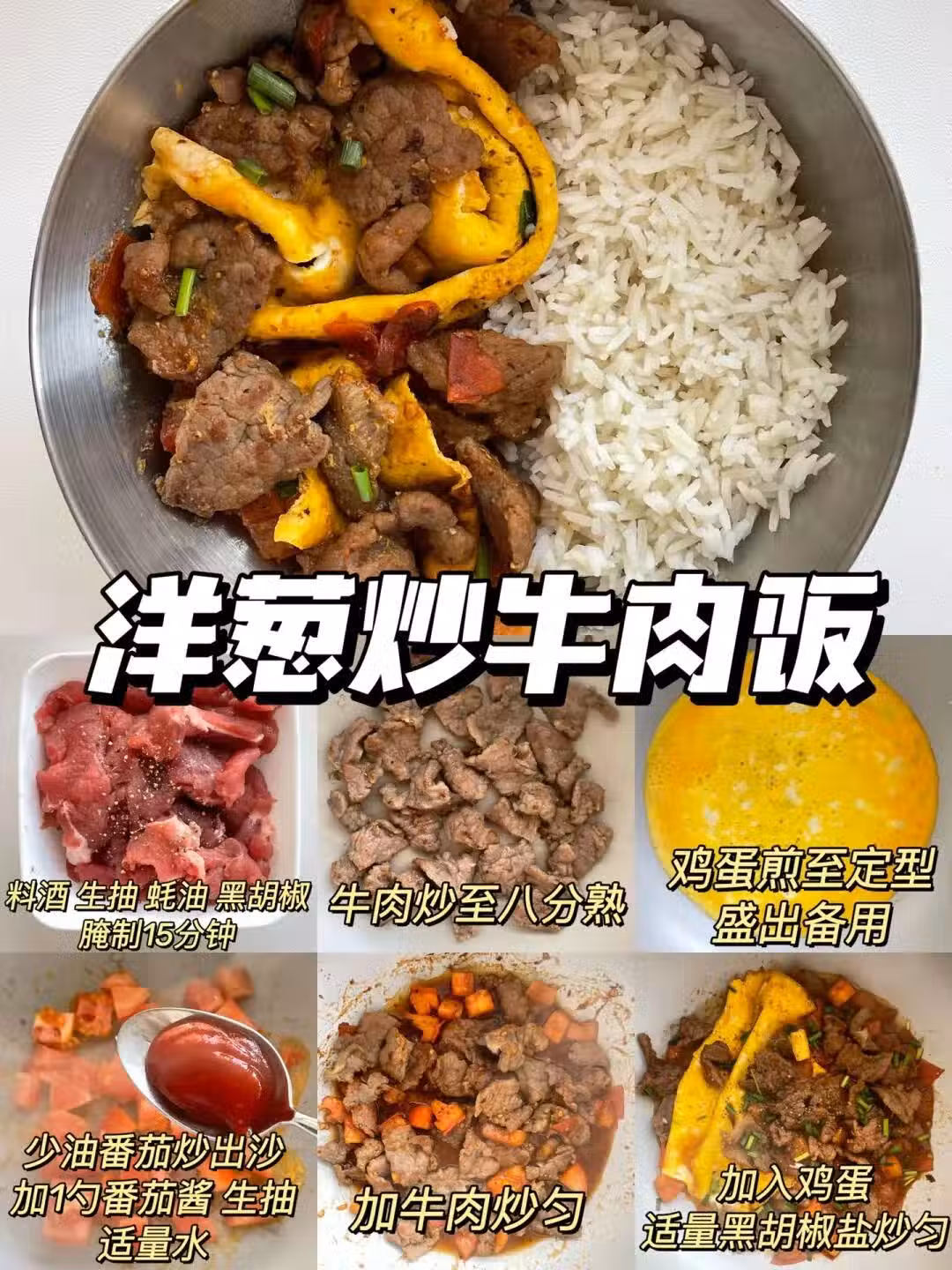 準備食材:洋蔥、牛肉、雞蛋、蔥花、番茄 配料:生抽、蚝油、黑胡椒粉、番茄醬、料酒 做法步驟:牛肉切片,加入料酒、生抽、蚝油、黑胡椒粉腌制15分鐘;油熱下牛肉炒至八成熟後盛出;雞蛋打撒後倒入平底鍋中煎至定型備用;鍋熱少油放入番茄炒軟,加番茄醬、生抽和適量清水炒出汁,最後加入牛肉炒勻,放入雞蛋,適量黑胡椒翻炒均勻即可。