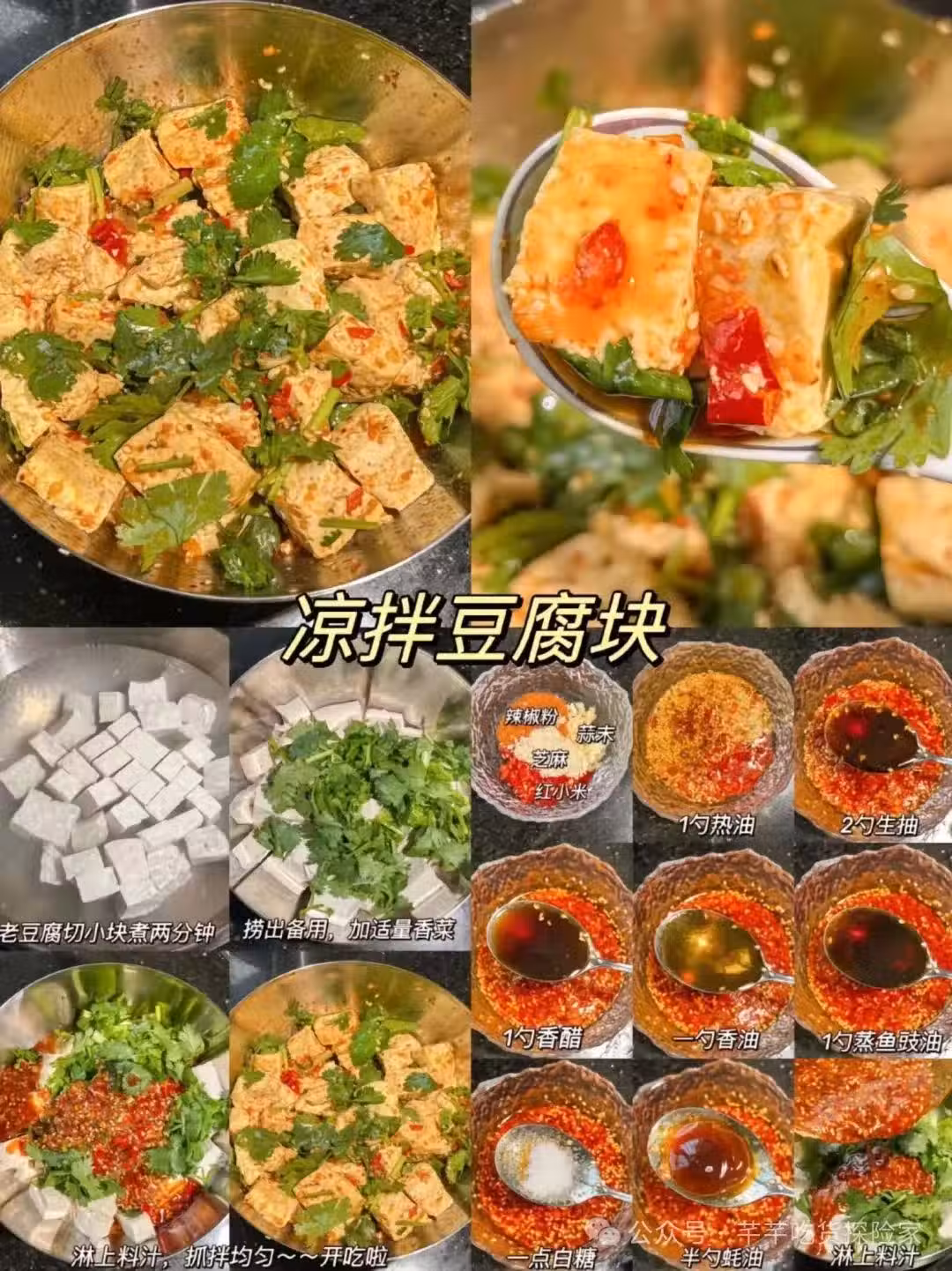 準備食材:豆腐,香菜,小米辣,辣椒粉,蒜末,白芝麻,生抽,香醋,香油,蒸魚豉油,白糖,蚝油,熱食用油。